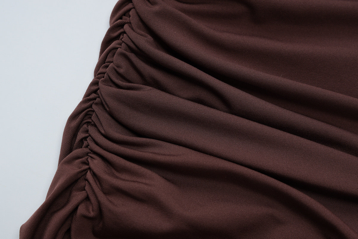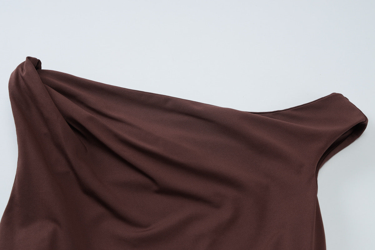 Maxi brown dress with twist shoulder strap, cut out at waist and gold swirl accent