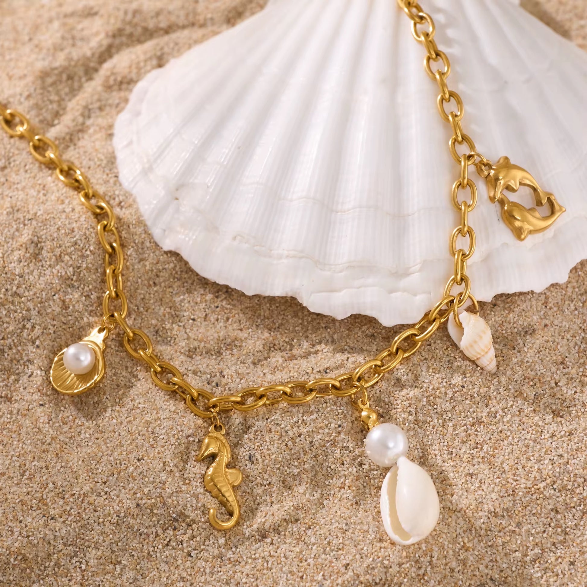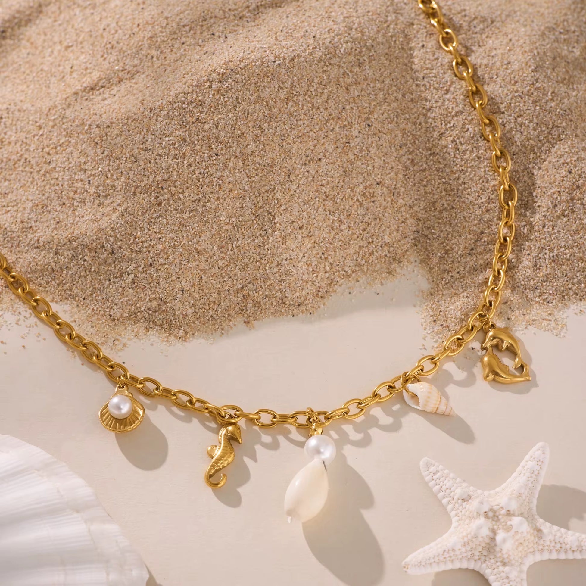 Gold chain necklace with ocean charms.